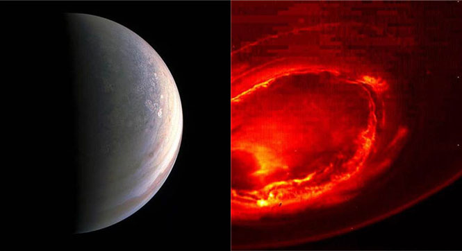 美国国家航空航天局(NASA)今天首度公开无人太空探测船朱诺号(Juno)拍摄到木星北极和南极极光的画面。