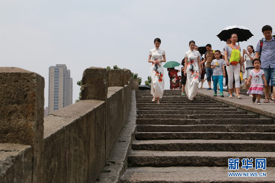 拱宸桥面上徐徐走来的姑娘是本次G20杭州峰会的志愿者。栩栩如生的杭州刺绣,搭配姑娘优雅大方的仪态,加之中英文双语的精彩讲解,让中外游客印象深刻。新华网 翁 璟 摄
