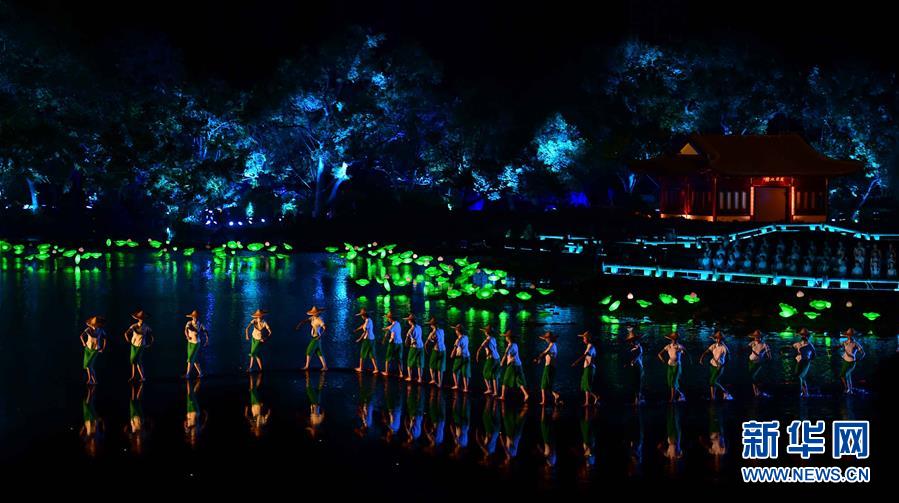 9月4日,演员在表演《采茶舞曲》。当日,出席二十国集团领导人杭州峰会的G20成员和嘉宾国领导人及有关国际组织负责人在杭州西湖景区观看《最忆是杭州》实景演出交响音乐会。新华社记者 张铎 摄