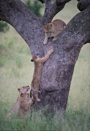 随后,其它两只小狮子围了过来,其中一只试图将它推上树叉处,然而收效甚微。一直帮不上忙的母狮子伸出了爪子想将它拉上去,不过这时候的小狮子已经在向下滑了,所以最终它还是没能爬上树叉。