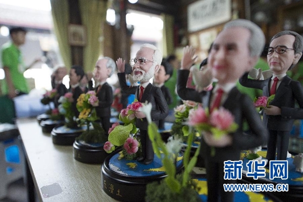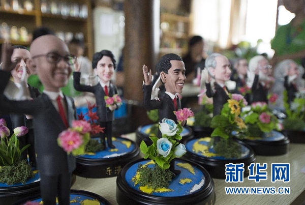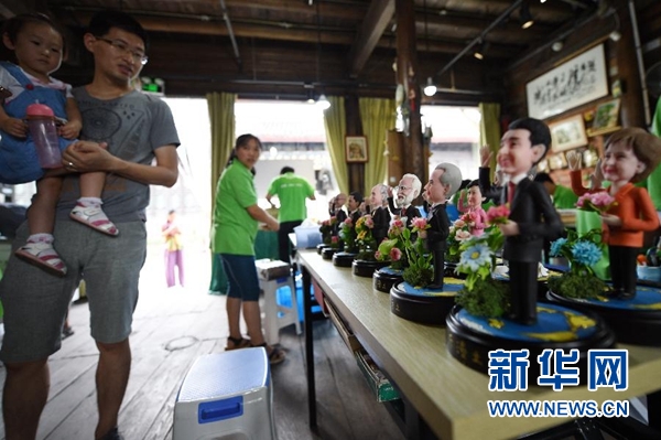 9月1日,手工艺人吴小莉创作的捏塑作品G20杭州峰会参会领导人形象在杭州京杭大运河畔的桥西历史街区摆放展示。新华社记者 鞠焕宗 摄