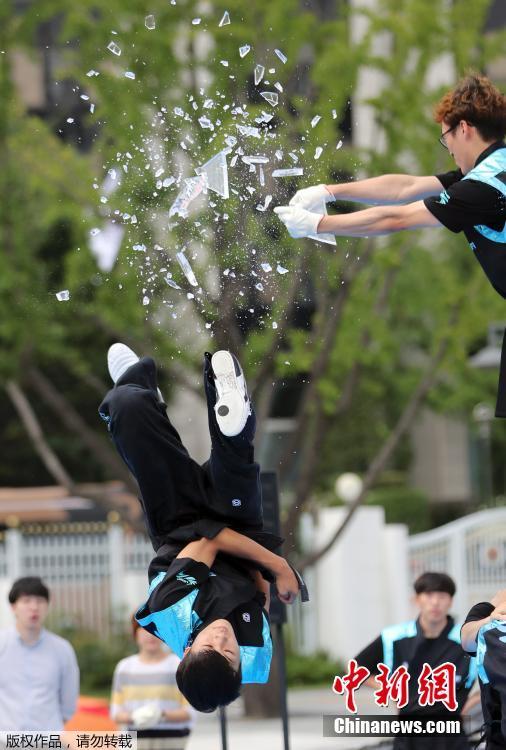 当地时间9月5日,在首尔光化门广场,参加武术表演活动的跆拳道队在表演腾空击破。当天的活动是为2016红牛踢腿大赛(RedBull Kick It2016)做宣传。