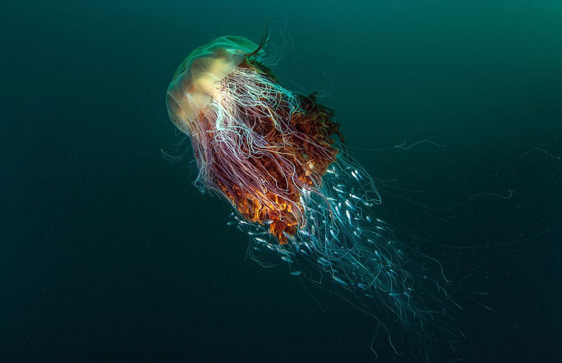 摄影师乔治 斯托伊尔(George Stoyle)以一幅霓虹灯一般的水母照片摘得桂冠,获得了5000英镑(约合人民币4.45万元)奖金。乔治说:“我在跳水结束之后游回船上的时候看到了这幅画面,无数小鱼藏在巨大的水母触手下,宛如那里是它们的避难所一样。”