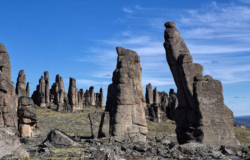 乌拉汗锡斯岭上,10-20米高的岩石拔地而起,犹如摩天大楼俯瞰西伯利亚风景。各座岩塔威严耸立,有如行进中的将士风化于此。岩石形状各异,却又独成一派肃穆景象。其壮丽风景,透过摄影师的眼中,已让人们倍感震慑。如置身于此,更让人不禁惊叹于大自然的鬼斧神工!