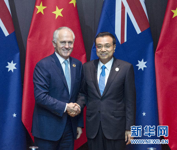李克强表示,当前世界经济复苏依然乏力,“逆全球化”思潮和贸易保护主义有所抬头。中澳都是本地区重要国家,并互为重要合作伙伴。双方应继续秉持相互尊重、平等相待,增进互信、加强合作,共同反对贸易保护主义,积极培育新经济、新业态、新模式。双方可以在创新、投资等领域挖掘合作潜力,共同营造更加公平友善的营商环境,更好实现互利共赢。