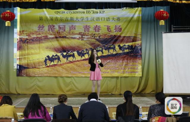 2015年12月3日,在吉尔吉斯斯坦比什凯克,一名大学生参加第三届吉尔吉斯斯坦大学生汉语口语大赛。 新华社发(罗曼摄)