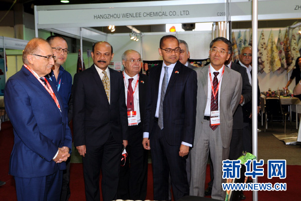 中国驻约旦大使潘伟芳(前排右一)陪同约旦副首相兼工贸大臣贾瓦德·阿南尼(左一)参观中国商品展。新华网记者程春香摄