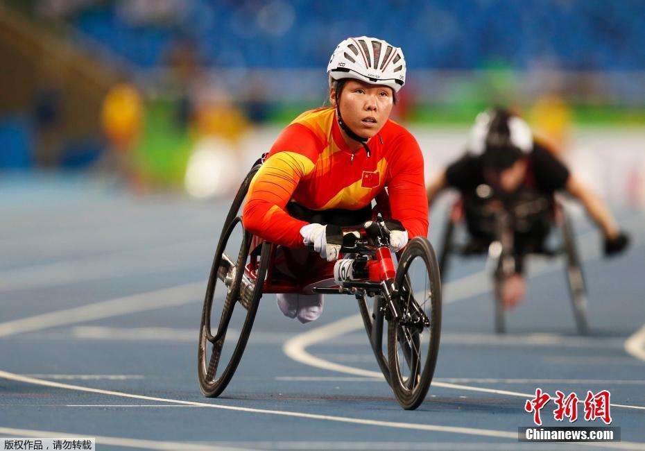 9月8日,巴西里约,2016里约残奥会首日,T54女子轮椅100米赛,中国选手黄丽莎夺冠。