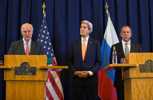 9月10日,在瑞士日内瓦,美国国务卿克里(中)、俄罗斯外长拉夫罗夫(右)和联合国秘书长叙利亚问题特使德米斯图拉出席联合记者会。美国国务卿克里和俄罗斯外长拉夫罗夫10日凌晨在日内瓦就叙利亚停火协议达成一致,新的停火协议将于下周生效。 新华社记者 徐金泉 摄