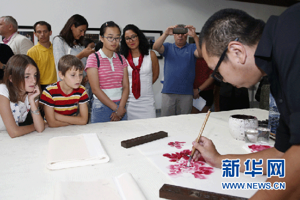 9月10日,在比利时首都布鲁塞尔中国驻欧盟使团,小朋友观看画中国画。新华社记者叶平凡摄