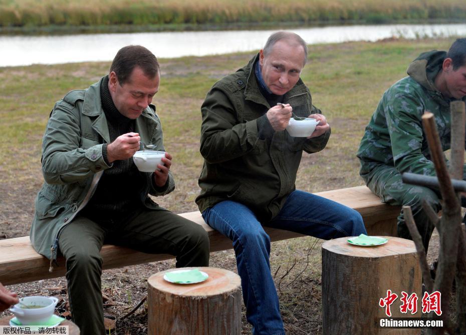 普京梅德韦杰夫野外坐板凳吃饭 为选举拉票造势(图)