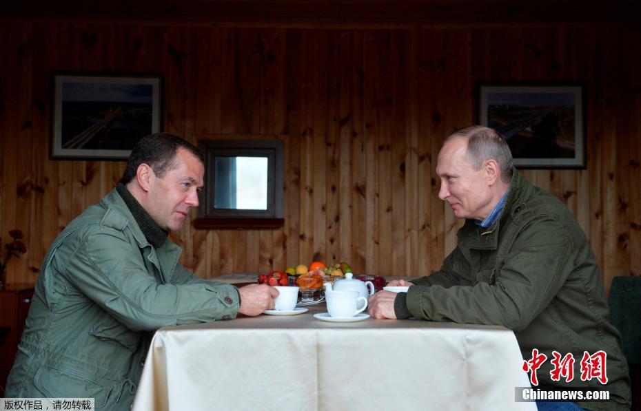 普京梅德韦杰夫野外坐板凳吃饭 为选举拉票造势(图)