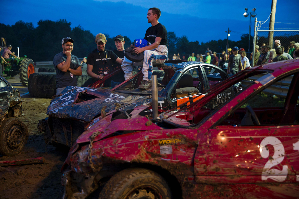 当地时间2012年8月3日,美国宾夕法尼亚州埃本斯堡,年度撞车大赛在当地举行,撞车大赛是一项美国传统赛车活动,通常于夏季在一些乡村节日期间举行,选手们驾车故意互相碰撞,直到剩下最后一辆可以开动的汽车。