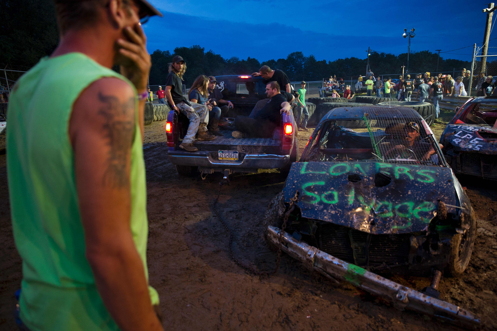 当地时间2012年8月3日,美国宾夕法尼亚州埃本斯堡,年度撞车大赛在当地举行,撞车大赛是一项美国传统赛车活动,通常于夏季在一些乡村节日期间举行,选手们驾车故意互相碰撞,直到剩下最后一辆可以开动的汽车。