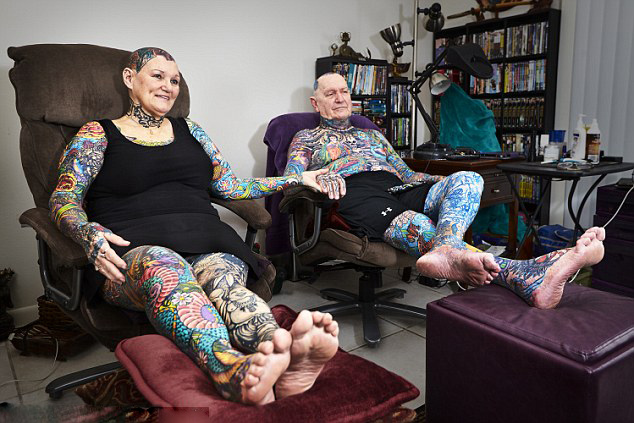 其他令人啧啧称奇的世界纪录还有美国佛罗里达州的夏洛特 古滕贝格(Charlotte Guttenberg)和查克 汉姆克(Chuck Helmke)夫妇,他们是世界上纹身最多的老年夫妇。古滕贝格太太今年67岁,她身上91.5%的面积都有纹身;汉姆克先生76岁,纹身面积达93.5%。