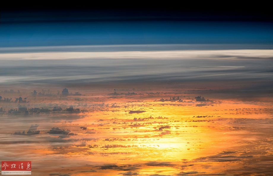 这次公布的彩色照片包括火星表面、太阳上的日食景象,以及我们的家园——地球。图为夕阳映射下的海洋。