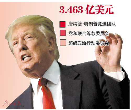 一直吹嘘自己“不愁钱”的共和党候选人特朗普比希拉里落后不少,数据显示,截至今年7月31日,他通过自费、竞选团队筹集、“超级政治行动委员会”贡献和筹款会募捐的竞选资金约为3.46亿美元。