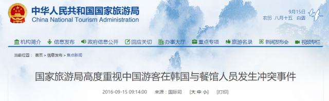 原标题:国家旅游局高度重视中国游客在韩国与餐馆人员发生冲突事件