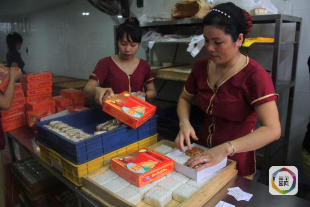 越南河内宝芳月饼店的工作人员将月饼装盒。新华社记者乐艳娜摄