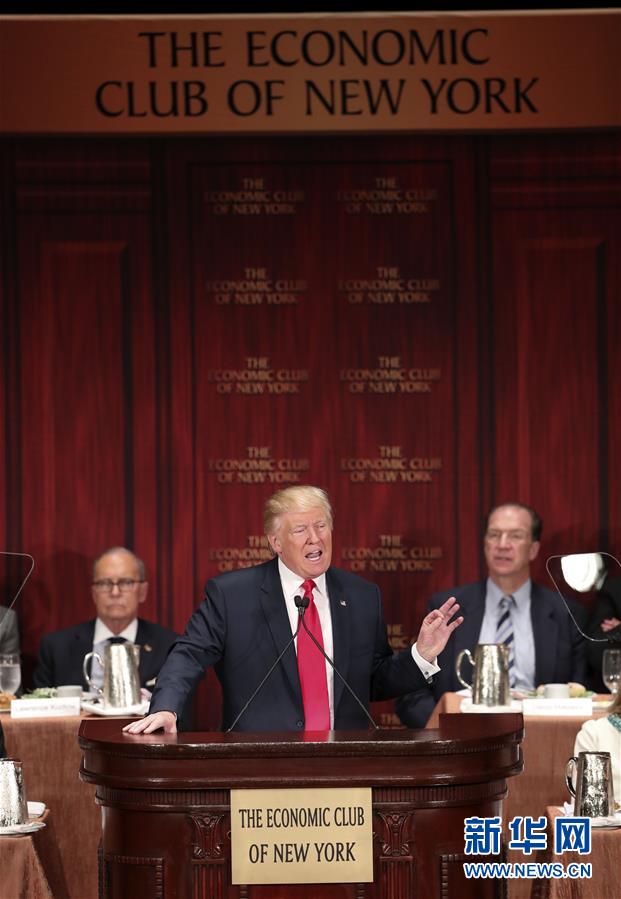 9月15日,特朗普在美国纽约经济俱乐部发表演讲。美国共和党总统候选人特朗普15日再次阐述了其包括税收、监管、能源、贸易等在内的一系列经济政策竞选主张,再次强调“美国优先”的原则。新华社记者王迎摄