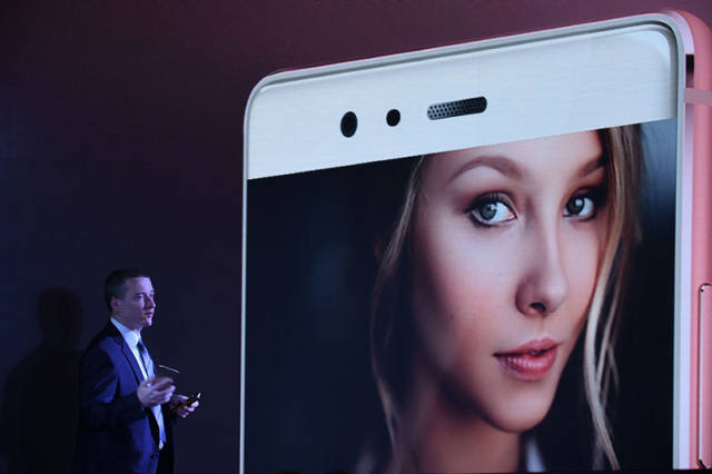 2016年6月7日,在俄罗斯莫斯科,华为手机产品经理伊利亚·秋林在发布会上介绍P9手机。(新华社记者戴天放摄)