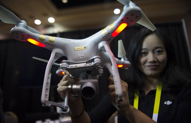 2016年1月4日,在美国拉斯韦加斯消费电子展的媒体预展上,工作人员展示大疆科技创新公司发布的新款无人机。(新华社记者杨磊摄)