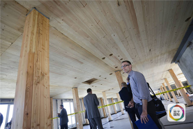出席庆祝仪式的嘉宾到场参观大楼内的木建筑