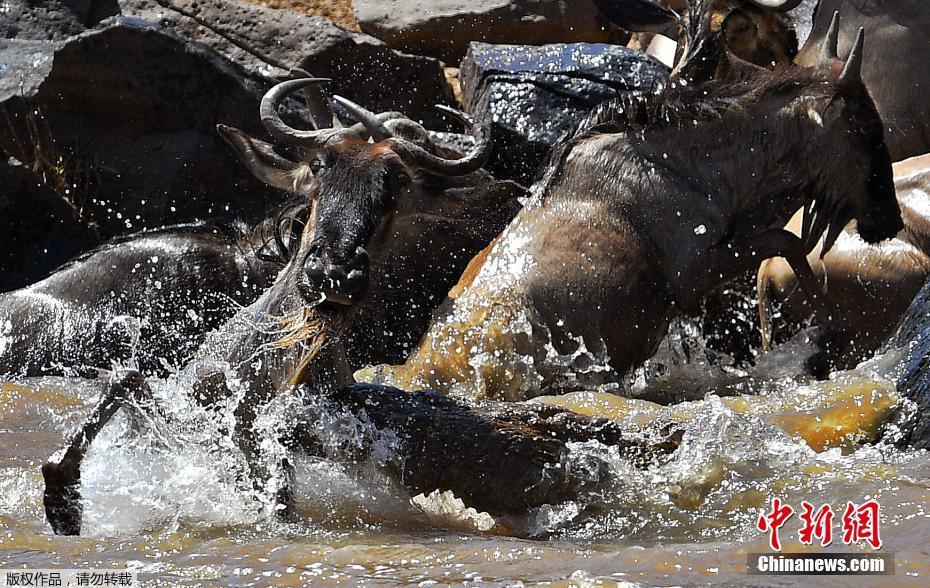 为了生存,在反复试探后,角马卷起漫天地灰尘前赴后继冲下河道。不幸者葬身“鳄吻”,幸运者得以逃脱,奔向又一处水草肥美的草场。