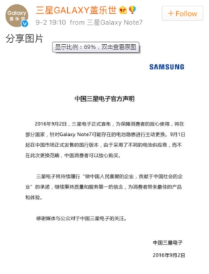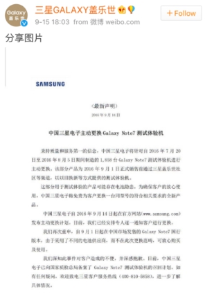 迫于压力,三星方面关于Note7在中国的政策也发生了变化。9月14日,三星在国家质检总局备案,宣布召回2016年7月20日至2016年8月5日期间制造的1858台Note7手机。