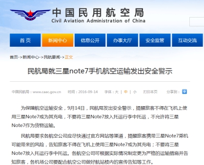 受三星“炸机门”事件持续发酵的影响,为了保障乘客出行安全,中国各大航空公司对三星Note7纷纷下达了“封杀令”! 9月13日,中国首家航空公司-海南航空宣布禁止集团员工携带Note7登机、托运,并且也不接受旅客在飞机上使用和托运Note7。随后,中国民航局要求各航空公司应尽快通过官方网站等渠道,提醒旅客携带Note7乘机可能带来的风险。截至9月15日,中国国内已有14家航空公司针对Note7出台禁令。