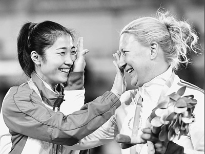 在第十五届残奥会上,中国健儿在赛场上奋勇争先,取得了优异的成绩。图为9月14日,轮椅击剑女子个人花剑A级比赛冠军获得者中国选手荣静(左)在颁奖仪式上与获得铜牌的匈牙利选手克拉伊尼亚克相互擦拭喜悦的泪水。新华社发
