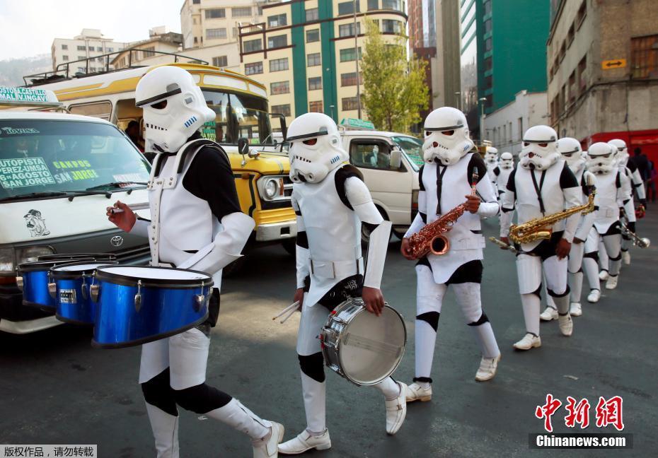 当地时间2016年9月19日,玻利维亚拉巴斯,当地一学校乐团身着星战“黑武士”服装展开街头演出。学生扮成《星球大战》中帝国风暴兵士模样,沿着市中心游行,并表演《星战》歌曲。
