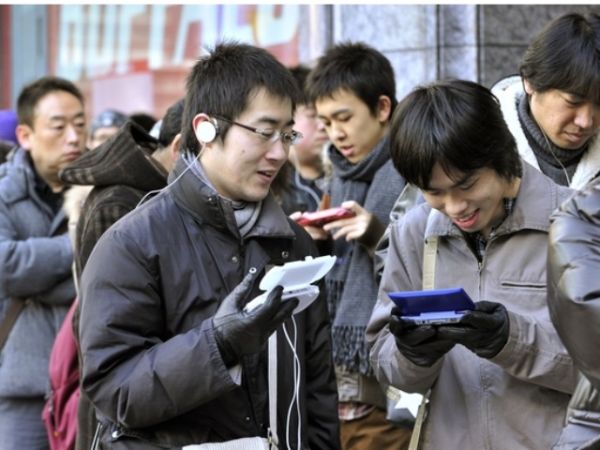 资料图:2011年2月26日,在日本东京一家电器商店外,年轻人排队购买任天堂掌上游戏机。(新华/法新)