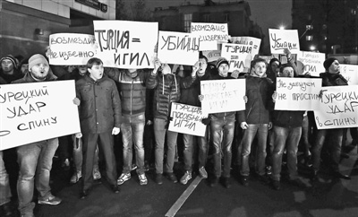 2015年11月24日,在莫斯科,俄罗斯民众手持标语牌抗议土耳其击落俄战机。人民视觉