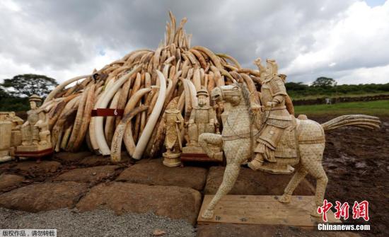 资料图:肯尼亚内罗毕,肯尼亚野生动植物局进行走私象牙焚烧准备工作。