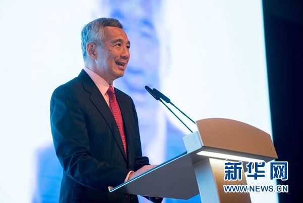 新加坡总理李显龙出席新加坡中华总商会110周年庆典晚宴并致辞。新华网发(王应耀 摄)