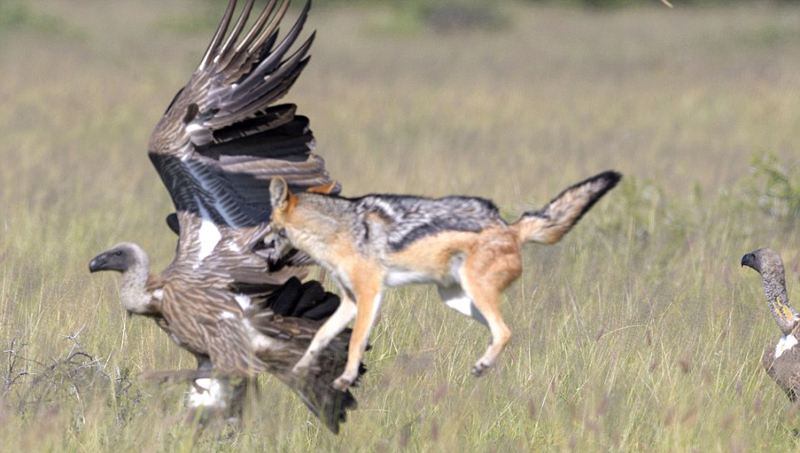 据报道,豺狼多以动物尸体为食,但长腿和弧形犬齿也使其不失为出色的猎手,捕食鸟类和爬行类的小动物。而秃鹰很少攻击健壮的动物,它们宁愿去等待其他食肉动物吃剩的残骸。除此外,这种投机的大鸟还会去恐吓、追赶小体型的动物,找机会偷食他们的晚餐。