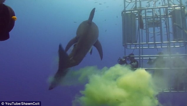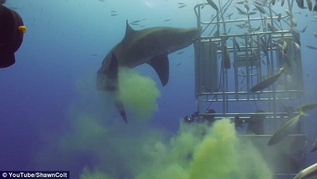 据当时的潜水员称,一开始他们在水下安静地观察着一只大白鲨并且进行拍照,不知道是不是由于闪光灯的缘故,这条大白鲨突然变得很愤怒,并且还从自己的身体里排出了一堆黄绿色的液体,由于当时潜水者都处在笼子里,无奈他们只能站在原地默默地忍受这些排泄物。