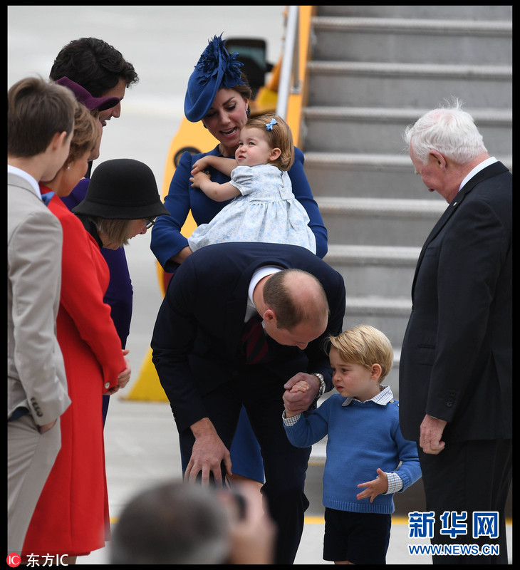 当地时间2016年9月24日,加拿大不列颠哥伦比亚维多利亚,威廉王子夫妇偕乔治小王子和夏洛特小公主访问加拿大,加拿大总理特鲁多偕夫人及加拿大总督大卫-约翰逊一同在机场迎接。图片来源:东方IC