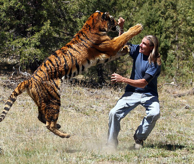 在美国加利福尼亚大熊湖畔,兰迪 米勒(Randy Miller)对他的宠物老虎艾登(Eden)发起了佯攻,一起玩游戏,十分亲密。他已经训练豢养大型动物25年了。