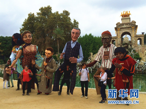 巴塞罗那城堡公园内,游客与“巨人”合影。新华网记者周喆摄