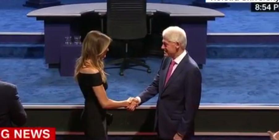 希拉里丈夫克林顿与特朗普妻子现场握手。