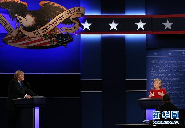 9月26日,在美国纽约州亨普斯特德的霍夫斯特拉大学,希拉里·克林顿(右)和唐纳德·特朗普参加2016年美国总统候选人首场电视辩论。美国东部时间26日晚9时,2016年美国总统候选人首场电视辩论在位于纽约州亨普斯特德的霍夫斯特拉大学开锣,民主党的希拉里·克林顿和共和党的唐纳德·特朗普首次同台正面交锋。新华社记者秦朗摄