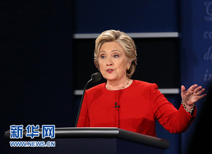 9月26日,在美国纽约州亨普斯特德的霍夫斯特拉大学,希拉里·克林顿参加2016年美国总统候选人首场电视辩论。新华社记者秦朗摄