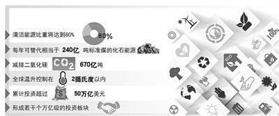 专家预测,到2050年全球能源互联网初步建成时,清洁能源比重将达到80%,每年可替代相当于240亿吨标准煤的化石能源,减排二氧化碳670亿吨。届时,全球温升控制在2摄氏度以内的目标有望实现。这一发展低碳经济、实现能源变革转型的系统性解决方案,赢得潘基文、世界银行行长金墉、美国能源部长莫尼兹等的高度赞赏和积极支持。