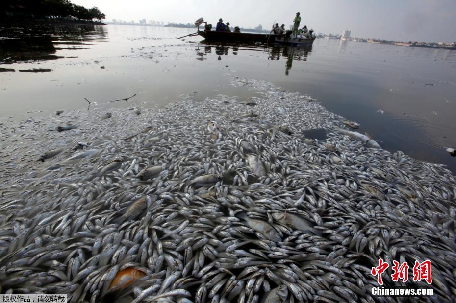 当地时间10月2日,越南河内西湖污染严重,湖里鱼大量死亡工人在被污染的西湖上打捞死鱼。