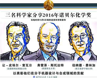 斯德哥尔摩时间5日11时45分,北京时间17时45分,2016年诺贝尔化学奖授予了3位科学家:法国斯特拉斯堡大学的让-皮埃尔·索瓦日教授、美国西北大学的弗雷泽·斯托达特爵士以及荷兰格罗宁根大学的伯纳德·L·费林加教授,获奖理由是“分子机器的设计与合成”。很多人之前都猜测这次诺贝尔化学奖多半会颁给生物化学,没想到难得地颁给了纯化学领域的科学家,尽管“分子机器”并不是大热门。
