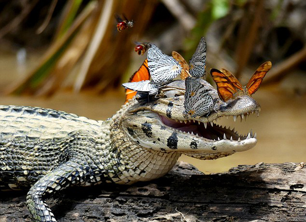 萌!鳄鱼被蝴蝶围绕心情愉悦露齿而笑(图)