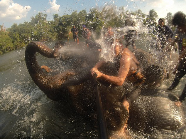 克莱顿的自拍照捕捉下了这一爆笑瞬间:在他毫无准备时,大象“一鼻子”水对他浇了下去,水花四溅,克莱顿又惊又笑,滑稽不已。克莱顿后来回忆说:“导游根本没提过说大象会朝我们喷水。当时我正拿着自拍杆拍照,结果水兜头而下,我吓了一跳,自拍杆都差点掉下去。”