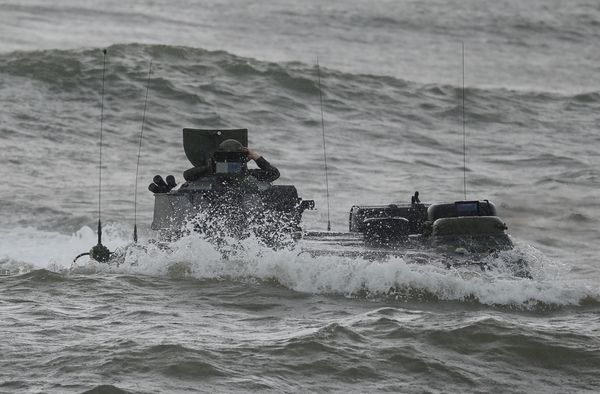 10月7日,在马尼拉北部三描礼士省圣安东尼奥一个海军训练基地,美国海军士兵参加菲美两栖登陆演习。(新华/法新)
